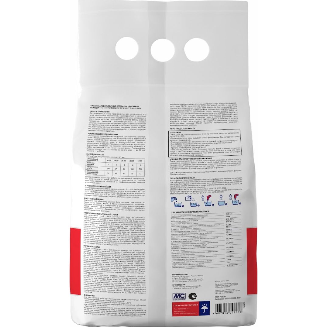 Клей для плитки, керамогранита, камня Plitonit (Плитонит) В экспресс Вб быстротвердеющий серый класс С1ТF 5 кг