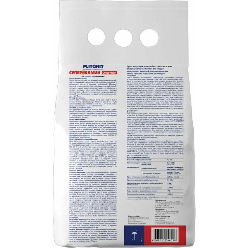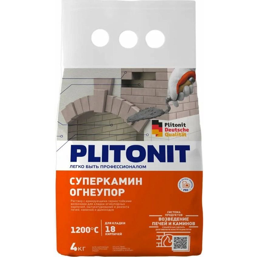 Раствор с армирующими волокнами для кладки огнеупорных шамотных кирпичей, оштукатуривания и ремонта печей, каминов, мангалов и дымоходов. Можно использовать внутри и снаружи помещения на шамотный, глиняный кирпич. Температуростойкость: Т20 (+1200 град). Начало эксплуатации печи возможно через 72 часа.