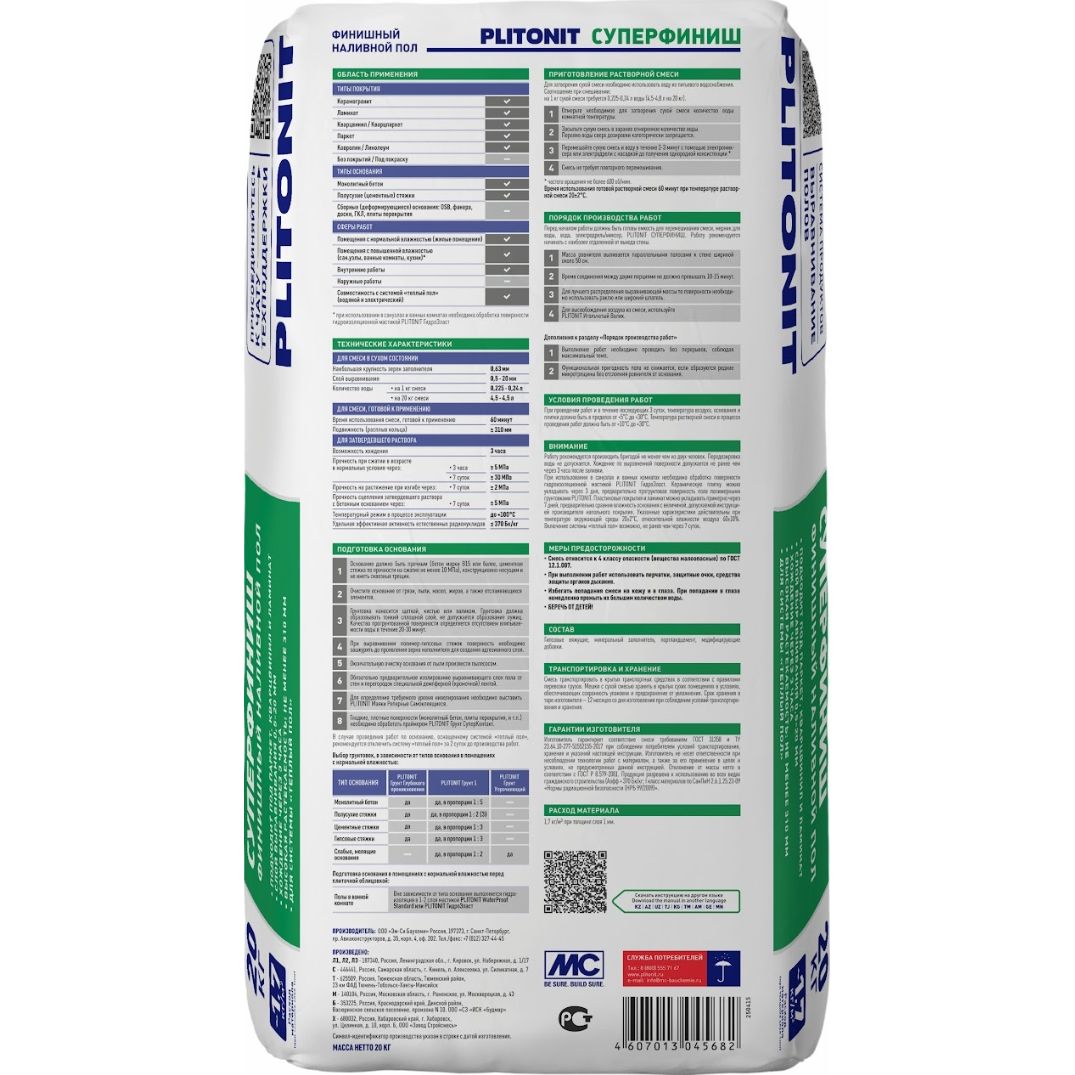 Финишный наливной пол Plitonit (Плитонит) СуперФиниш быстротвердеющий самовыравнивающийся 20 кг